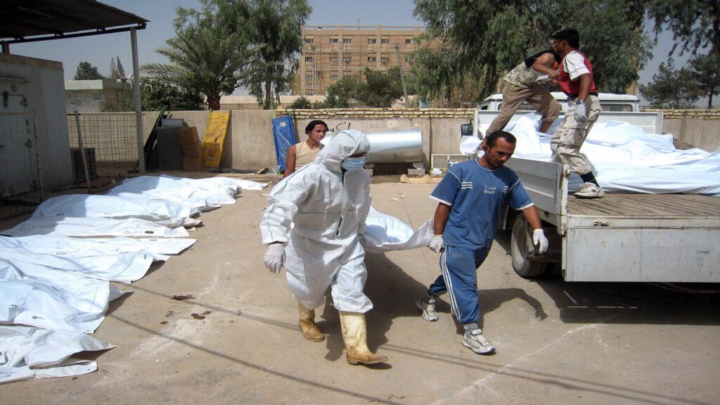 Body bags are loaded onto a truck to be taken to a mass grave in the northeastern Sunni city of Baquba, 45 kilometers from the capital Baghdad on June 9, 2008. Twenty five Sunni bodies were laid to rest after two month at the morgue waiting to be identified. Across Iraq many bodies are brought to hospitals and are never identified by relatives. They are then buried by the local municipalities.